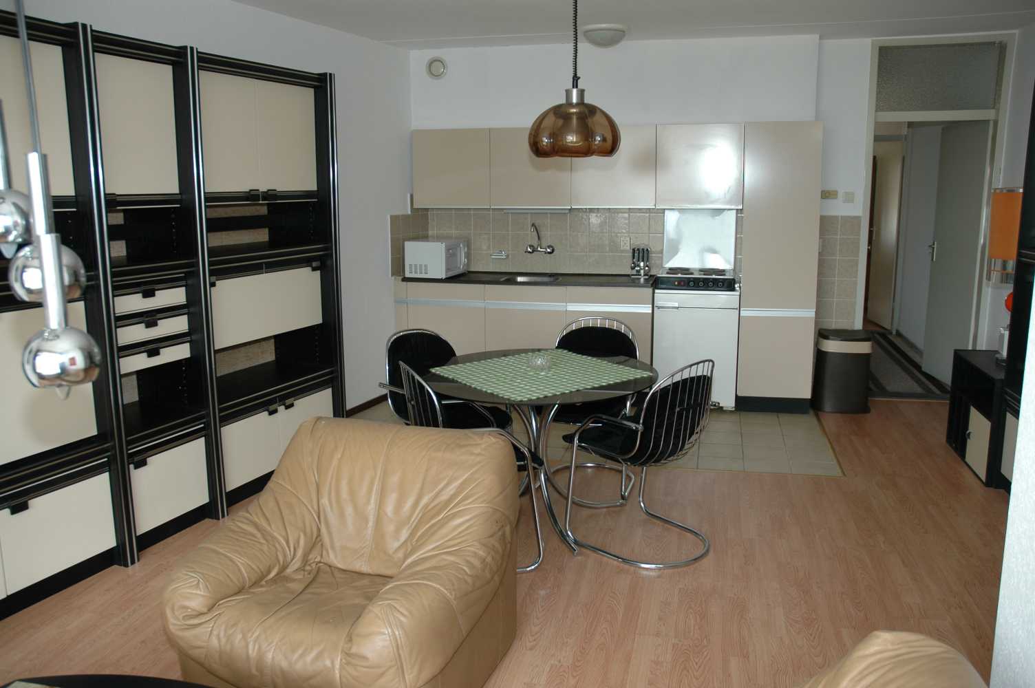 De indeling is als volgt: - Halve gang met plavuizen; - Woonkamer, asymetrisch (zie de plattegrond van dit pand) met parket-laminaat; - Keuken met plavuizen, inbouwkeuken met losse electrische kookplaat, koelkast en magnetron; - Tweede halve gang met plavuizen; - Badkamer: douche cabine, vaste wastafel en toilet; - Bergruimten: in de hal en in de badkamer; - Slaapkamer met laminaat-parket; - Energiezuinige HR-CV-ketel; |